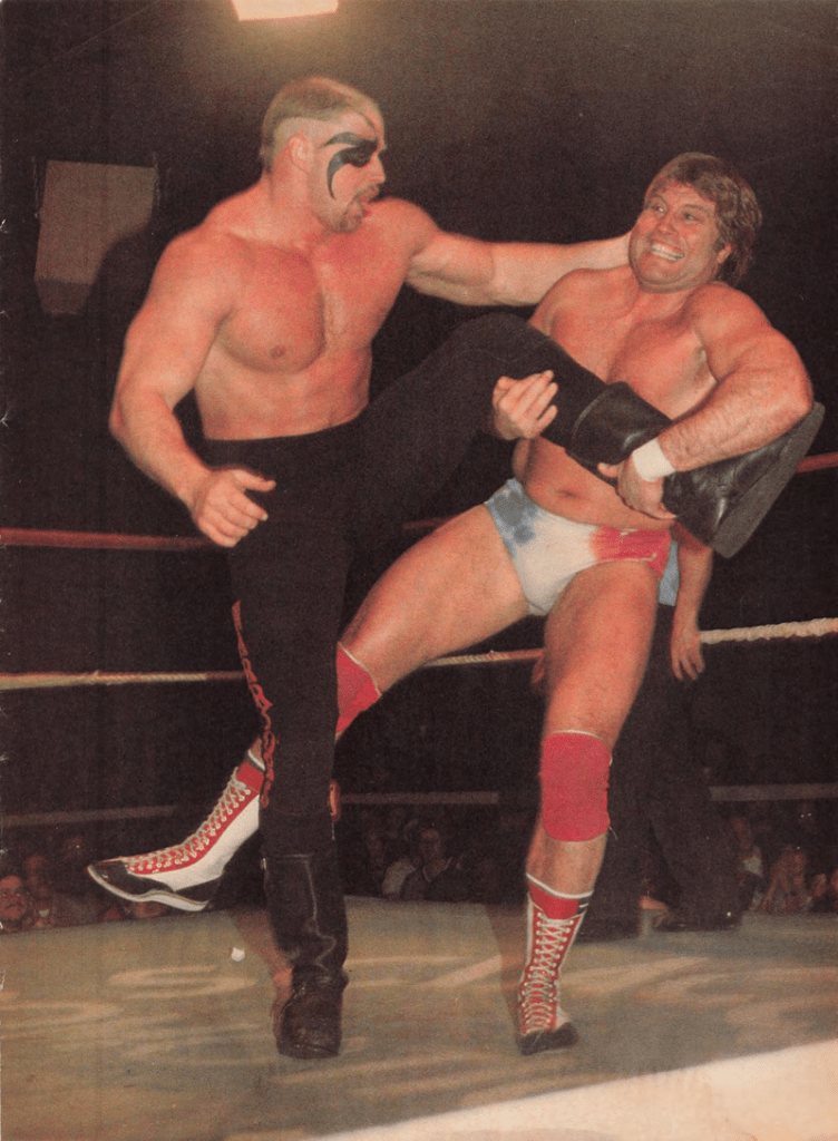 Jim Brunzell (Right) attempts to sweep the leg of Road Warrior Hawk (Left), 1985