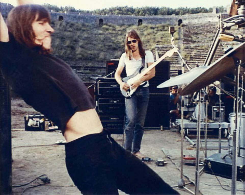 It takes approximately a full three minutes (possibly more) for the camera lens to absorb the deserted vastness of the ancient Roman amphitheater in Pompeii before slowly settling on the four members of Pink Floyd as they leisurely run through their 1971 tune “Echoes” under the blazing Neapolitan sun. Some, like guitarist/singer David Gilmour, understandably do it shirtless. The snail-like pace of the zoom also helps to establish that there is no one else there except the band and a film crew of about ten people. Which explains why director Adrian Maben seems intent on filling the space with the spirits of Rome’s past by conjuring up images of mosaics and rock sculptures fitting for the setting. That is, when he isn’t relying on footage of boiling mud and volcanic eruptions to really drive the point home.
