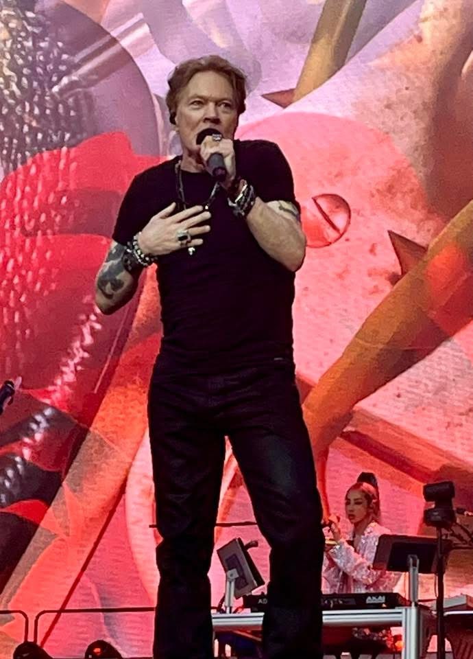 Slash, the top hat-wearing, six-string virtuoso, remains the group’s MVP during live gigs. When not tearing it up on his usual arsenal of Gibson Les Paul guitars, it was nice to see him trade those in for an axe that resembled Chuck Berry’s vintage Gibson ES-355 for “Yesterdays,” or a Gibson Explorer for an even rarer rendition of the U.K. Subs’ “Down on the Farm,” which the band originally covered on their 1993 album The Spaghetti Incident? A guitar solo that preceded megahit “Sweet Child O’ Mine” felt fresh and renewed by having the other musicians join in to create the feel of a barroom blues shuffle. Covering Jimmy Webb’s “Wichita Lineman,” which the group frequently likes to do nowadays, allowed Slash to showcase his chops on acoustic guitar, providing a welcome variant. And “Rocket Queen,” a GN’R live staple, continued to be a highlight by allowing rhythm guitarist Richard Fortus to deliver a blistering introductory solo, which nicely dovetailed into Slash’s own, replete with a talk box accompaniment for the tune’s extended middle section.