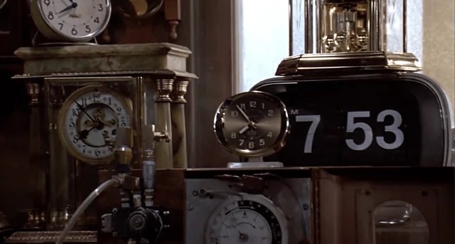 Once we fade in on Doc’s dwelling, we are bombarded by the sights and sounds of dozens of clocks of all varieties, shapes, and sizes. A few of them are wall-mounted, but most sit on counters, including one that features a tiny image of Harold Lloyd dangling from its minute hand; a direct nod to the iconic scene from the 1923 silent film Safety Last! It may seem minor – in part because it’s thrown in amidst such a large collection – but the sight of this particular clock proves to be the movie’s first bit of foreshadowing, as later on, during its climax, Doc himself will be doing that exact same thing for the sake of sending his teenage buddy Marty McFly back to the future. The fact that both actors who immortalized this stunt share the same last name is surely a bizarre coincidence, but a welcome one all the same.