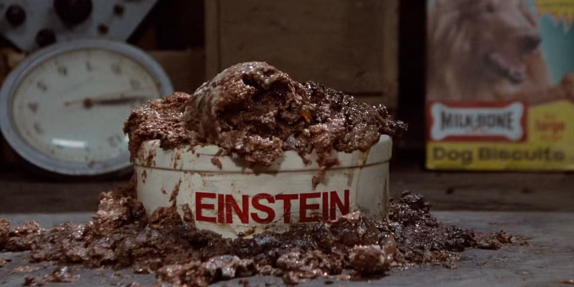 Staying on this theme of electronics, a toaster shoots out two squares of burnt toast, which is soon followed by the sight of a mechanical, factory-like claw grabbing a can of dog food and pivoting to the other side where an electric can opener awaits to do its job. Once opened, the claw dumps the contents of the can into a dog bowl that rests on the floor below. Said bowl bears the inscription “Einstein” on its side – the second mention of the genius scientist in the last two minutes – and the fact that it is disgustingly overflowing with wet dog food only accentuates the point that neither Doc nor his canine have been home as of late, and are clearly busy with other matters.